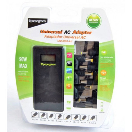 Alimentador universal automático de 90 W de potencia para ordenadores portátiles y pantallas incluye un puerto USB de salida 5.1 V 2 A para poder cargar cualquier aparato por USB como por ejemplo teléfonos móviles, reproductores USB o tablets.